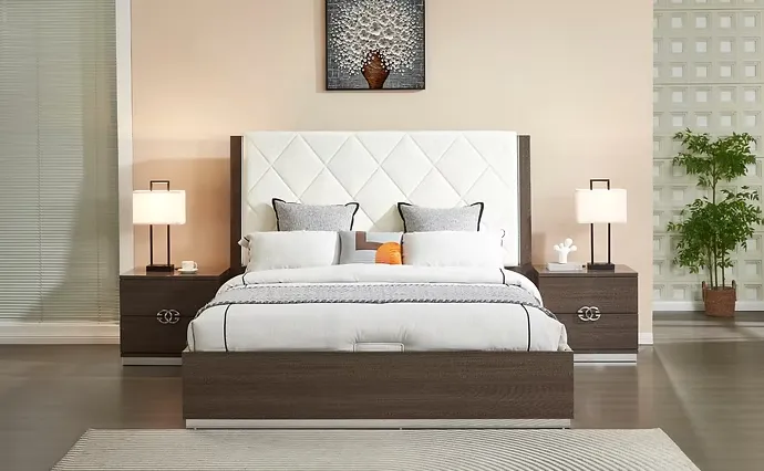 Upholstered Headboard: The bed features a striking upholstered headboard, with a geometric or diamond-stitched pattern, providing both visual appeal and comfortable support for sitting up in bed.