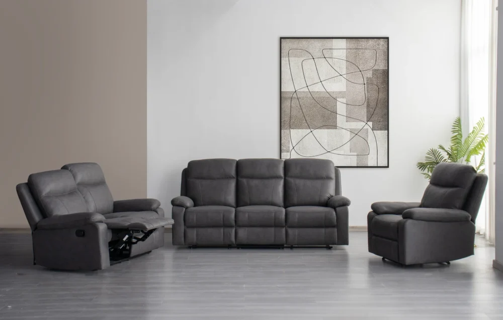 Refresh your living room with this stylish 3-piece manual reclining set, designed to deliver relaxing comfort and a modern, inviting look. Upholstered in high-quality leather-gel material, each piece features plush cushions, supportive headrests, and clean stitching details that add a refined touch.