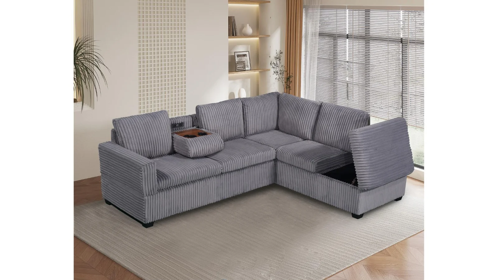 Dark Grey | Storage Chaise | Storage Ottoman | Drop-Down Tray with Cupholders