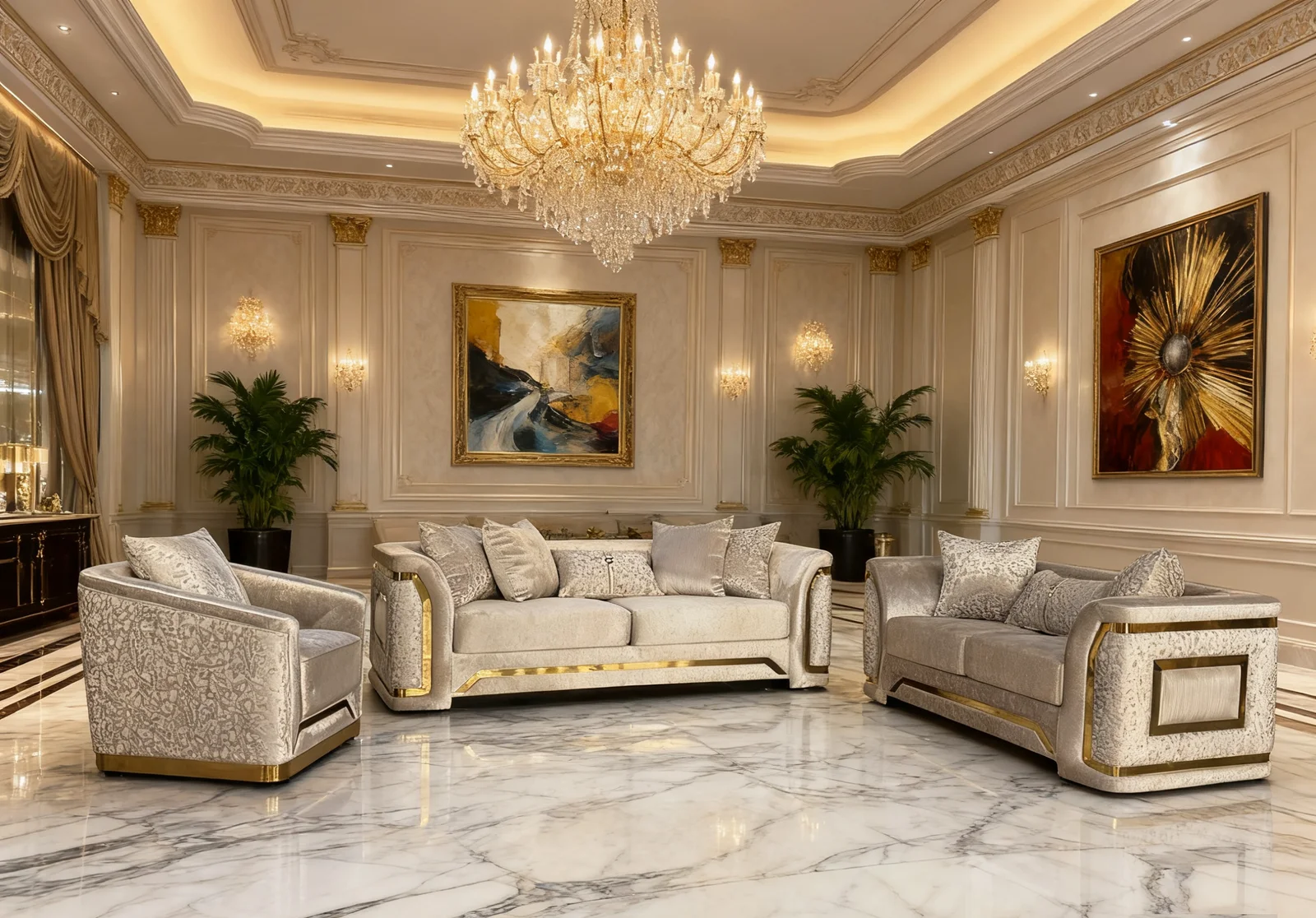 - The set is adorned with striking gold trim and bases, including a decorative gold frame along the arms and base of each piece, adding to its luxurious appeal.